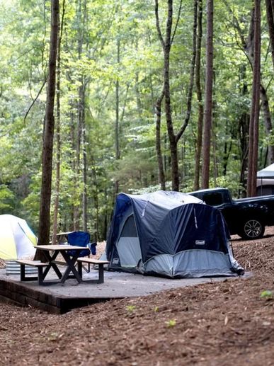 Reserve one of our platform tent sites with electric hookup under the serenity of the trees or roam the expansive property to find your perfect camp site. Whether you prefer to be near the action with access to electricity or looking for a more primitive tenting experience, you're sure to find the ideal spot. Some tent sites are conveniently located with quick access to the pool, hot tub, and campfire circle. Feel free to use our spacious, fully equipped kitchen and dining area inside the lodge.